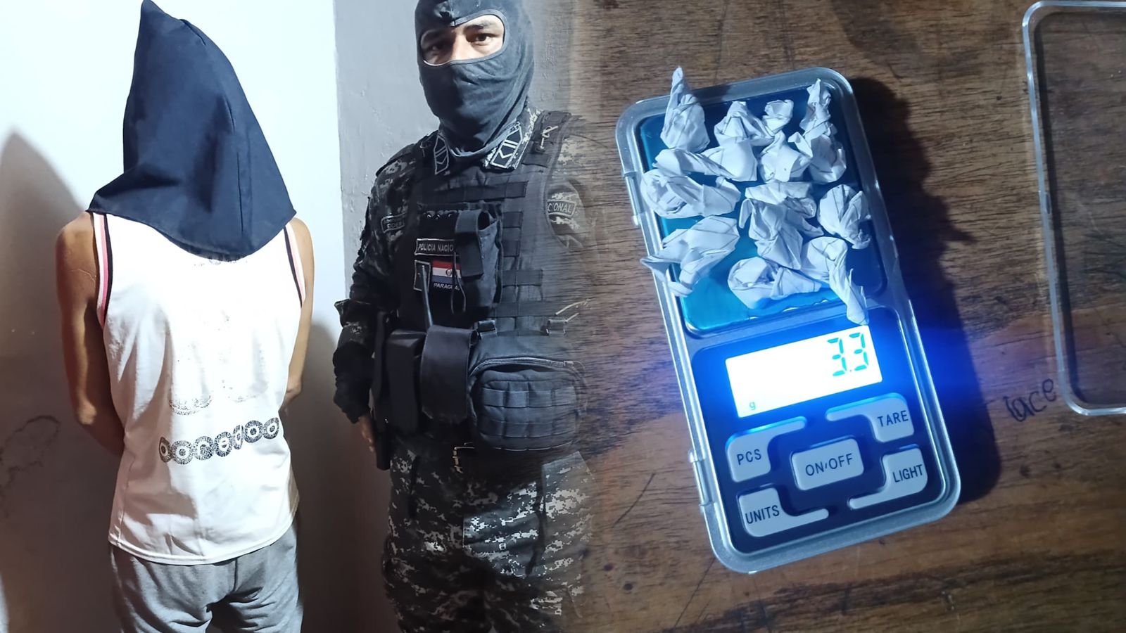 Al proceder a su verificación e inspección corporal, los agentes hallaron en su poder 12 dosis de una sustancia amarillenta, presumiblemente cocaína tipo crack, envueltas en papel. Además, se incautaron de la suma de 192.000 guaraníes en efectivo y un teléfono celular de la marca Samsung, color negro.