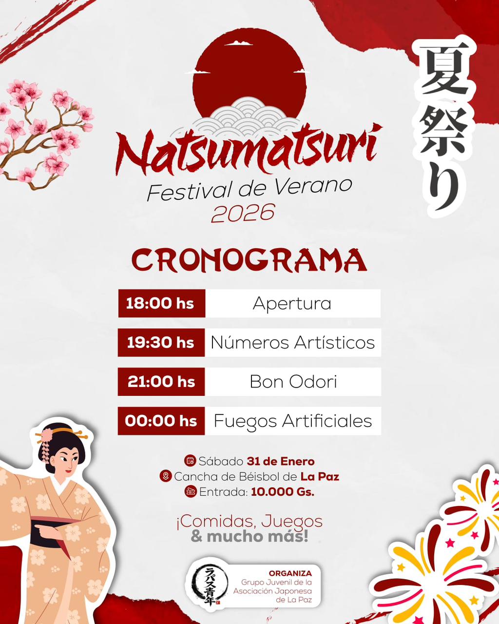 El Natsumatsuri 2026 promete convertirse en una verdadera fiesta multicultural durante este sábado 31 de enero desde las 18:00 horas en la localidad de La Paz, que no solo busca celebrar las tradiciones japonesas, sino también dinamizar el turismo, fortalecer la integración cultural y generar un impacto positivo en la comunidad.